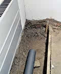 Трубы системы пластиковой канализации укладываются раструбом, направленным от наружной стены дома (в данном случае, при проведении монтажа в зимнее время, выпускной приямок решили копать после запуска системы отопления) |