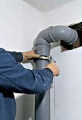 С помощью прямоугольных колен направить вытяжную часть стояка системы пластиковой канализации в отверстие на стене и далее, через потолочное перекрытие, на крышу (для загородных домов) |